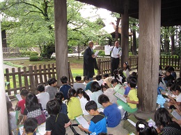 2回目は、雨天のため、広園寺のみ見学に行きました。広園寺の山門の下で、和尚様に、1390年、今から約600年前に開山したお寺であること、広園寺の七不思議の話などを伺いました。実際に手玉石や虫塚、いぼとり地蔵などを見せていただき、感心して帰ってきました。山田地域の歴史、温かい心、重要な文化財、豊かな自然を感じ、有意義な町たんけんでした。