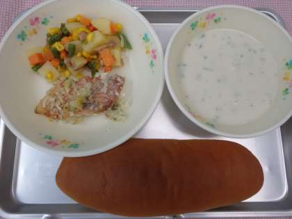 今日の魚は「赤魚」です。名前の通り体が赤い魚で、「あこうだい」や「めぬけ」などと呼ばれる魚をまとめたよび方です。赤い体をしていますが、身は白く、味はあっさりしていてあまりくせがないので、いろいろな料理方法で食べることができます。今日は、セロリ・パセリ・たまねぎ・パン粉を使って香草焼きにしました。