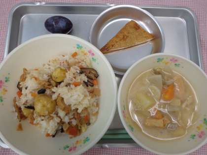 今日はくりをいれたふきよせおこわです。「ふきよせ」というのは風で落ち葉や木の実がふきよせられる様子をあらわした料理です。くりは5000年前の縄文時代からたべられていたといわれる歴史ある食べ物です。かぜ予防のビタミンC・つかれをとるビタミンB1・老化防止のビタミンB2・おなかのそうじをする食物繊維など1つぶにたくさんの栄養がつまっています。