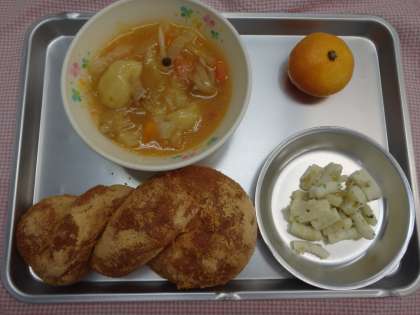 10月24日の給食 公開日 2016/10/26 更新日 2016/10/26 今日の出来事 <こんだて> きなこあげパン ようふうすいとん いかのハーブいため くだもの(みかん) ぎゅうにゅう 揚げパンなどの調理したパンが給食ででるようになったのは昭和30年代の終わりごろからで、昔から大人気です。きなこ揚げパンはきなことさとうを混ぜたものを揚げたパンにまぶしますが、きなこのいい香りがして、さとうだけをまぶした揚げパンよりも人気がありますね。