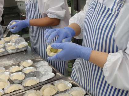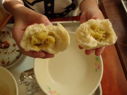 八王子では、江戸時代から酒まんじゅうが家庭でよく作られていました。八王子は平地が少なかったのでお米があまりとれず、蚕を育てたり麦や雑穀などを畑で作っていました。農家では麦や雑穀を発酵させ、小麦粉とあわせて酒まんじゅうを作っていたそうです。今日はさつまいもの餡を入れた酒まんじゅうを作りました。さつまいもは、1年生が学校の畑に植えて収穫してくれたさつまいもです。1つ1つ手作りの酒まんじゅう。おいしいさつまいもでおいしい酒まんじゅうができました。1年生たちも「おいしい!」と喜んで食べていました。