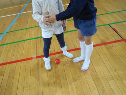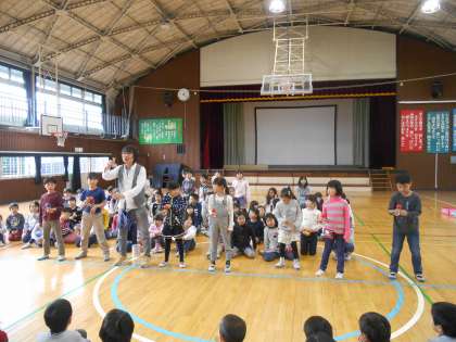 1年生は、3学期の生活科の学習で、けん玉とこまを中心に昔遊びに挑戦します。今日は、2年生にけん玉、こま、羽根つき、竹とんぼの遊び方、片付け方を教えてもらいました。こまコーナーでは紐を巻いてあげたり、けん玉コーナーでは手を支えてあげたり、2年生が優しく教えてくれました。1年生は上手にできなくても、「おしい!」「もっとこうするといいよ」と声を掛けてもらいながら、夢中になって取り組んでいました。