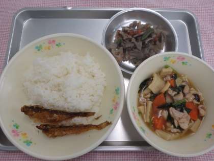 今日は石川県の郷土料理です。石川県は、日本海側にあり、1年間に降る雨の量が日本でも多い方です。特に山間部では雪が多いのが特徴です。はたはたは、石川県や秋田県など日本海側で11〜12月にとれる魚です。日本海に冬の到来を告げる魚だといわれています。じぶには、鴨肉や鶏肉に小麦粉をまぶし、季節の野菜と一緒に煮込む、寒い地域ならではのとろみのついた料理です。『加賀野菜』とよばれる伝統野菜があり、「加賀れんこん」「さつまいも」「加賀太きゅうり」など15品目が認定されています。今日のれんこんは加賀れんこんではありませんが、れんこんをつかったきんぴらを作りました。