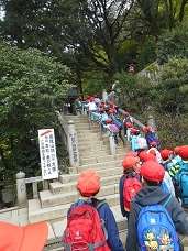 まずリフトに乗りました。初めて乗った子も多く、最初は緊張していましたが、乗ってみると乗り方のルールをしっかり守り、リフトから見える景色を楽しむことができました。その後山頂までは、徒歩で登りました。階段もたくさんありましたが、弱音を吐く子は誰もいなく、一生懸命登りました。歩いている途中で、事前学習で学んだ「天狗」を見て、学習を深めることができました。山頂に着いたら、いよいよお弁当。朝からお家の方に作って頂いたお弁当を楽しみにしていた子供たち。友達と仲良くおいしく食べることができました。