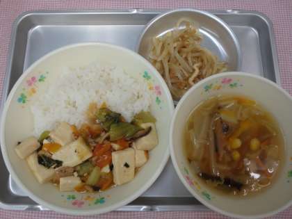 今日は豆腐を使ったメニューです。豆腐の「腐」は「やわらかい」という意味で、豆腐は「やわらかい豆」という意味です。今は毎日お店にたくさんあって食べられる豆腐ですが、江戸時代の初めまではぜいたく品で、お正月やお祭りなど特別の日に食べていたそうですよ。