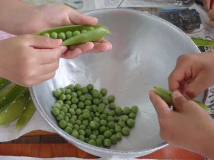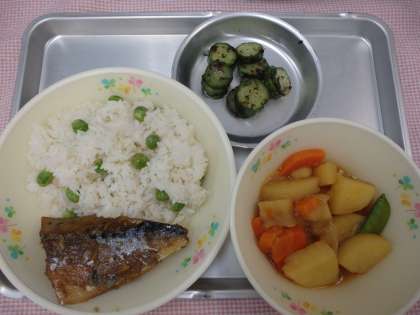 今日のグリンピースごはんのグリンピースは、2年生がさやむきをしてくれました。グリンピースは野菜ですが、熟すと豆になります。おなかの調子を整える「食物せんい」、体の調子を整える「ビタミン」、血や肉になる「たんぱくしつ」がふくまれていて栄養たっぷり!頑張ってむいてくれた2年生のためにものこさずたべてくださいね。