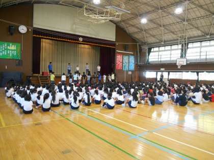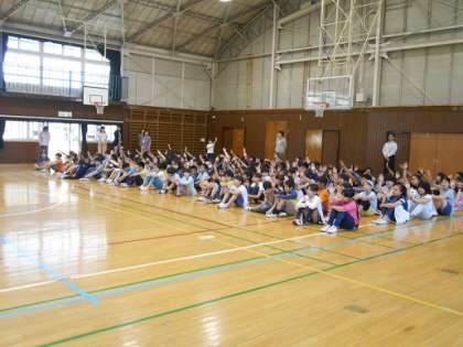 集会委員の3名の児童が同時に言葉を言い、何を言っているかを当てるゲームです。「つくえ」か「つくね」か・・・集会委員の児童が似ている言葉を集めて上手に問題を出してくれました。「どっちだろう」と悩み、正解すると大喜び!今年度初めてのレク集会はとても盛り上がりました。