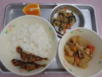 5月19日の給食 公開日 2017/05/22 更新日 2017/05/22 今日の出来事 <こんだて> ごはん まめあじのなんばんづけ だいこんのそぼろに アーモンドあえ くだもの ぎゅうにゅう 今日は東京2020オリンピック・パラリンピック競技大会に向けて「五つの輪で体力アップ」献立です。主食・主菜・副菜・果物・乳製品の五つの輪がそろった給食です。五つの栄養と食べる量について確認しましょう。 運動会まであと少しですね。五つの輪がそろった食事を食べて、頑張りましょう。