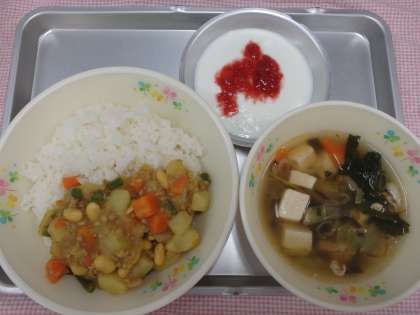 5月22日の給食 公開日 2017/05/24 更新日 2017/05/24 今日の出来事 <こんだて> サブジどんぶり チンゲンサイのスープ ヨーグルトいちごソース ぎゅうにゅう サブジ丼の「サブジ」とは、インドで野菜のことです。じゃがいもやにんじん・たまねぎ・さやいんげんといった野菜をたくさん使った、ルーを入れないさっぱりとしたカレーです。