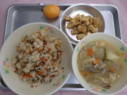 6月4日は虫歯予防デーです。虫歯を防ぐためにはよくかんで食べることが大切です。今日のごはんには、かみごたえのあるちりめんじゃこや豆が入っています。いかやとん汁に入っているごぼうやこんにゃくも、カミカミ食材です。ひとくち30回を目安に、よくかんで食べましょう。