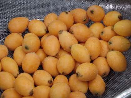今日の果物は今が旬の「びわ」です。皮は上についている茎の部分からタテにむくと、むきやすいですよ。実の中心には大きな種がいくつか入っているので、とりのぞいて食べましょう。みずみずしくてあまく、おいしいですよ。