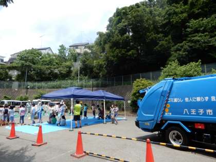ごみの分別について、学習しました。清掃事務所の方のご指導のもと、清掃車の実演を間近で見学しました。