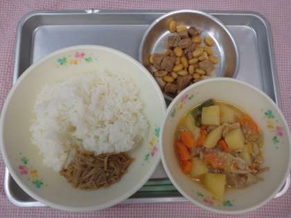 6月21日の給食 公開日 2017/06/26 更新日 2017/06/26 今日の出来事 <こんだて> ごはん なめたけ みそにくじゃが ぶたにくとまめのかくにふう ぎゅうにゅう 豚肉には、ビタミンB1という栄養がたくさん含まれています。牛肉のなんと10倍!ビタミンB1は、食べたものが体の中でエネルギーに変わるために必要な栄養素です。体の疲れをとってくれますよ。