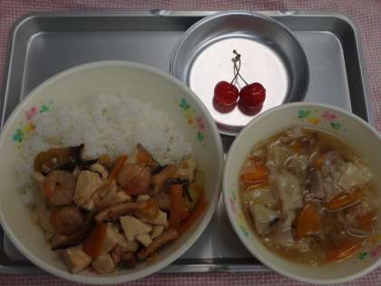 6月30日の給食 公開日 2017/07/03 更新日 2017/07/03 今日の出来事 <こんだて> かいせんどうふどんぶり ワンタンスープ くだもの ぎゅうにゅう 今日の果物はさくらんぼです。さくらんぼは、色が美しくて、値段も高いことから「赤い宝石」といわれています。とれる期間が6月から7月と、旬が短い果物です。今しか食べられないさくらんぼ、ぜひ食べてくださいね。