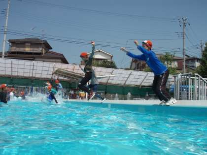 6年生が、着衣泳を行いました。通常の水泳学習で水慣れした後、用意してきた、長袖、長ズボンを上に着て、プールへ。水を吸って重くなった服に苦労しながら、浮いたり泳いだりしました。ペットボトルにつかまって、楽に浮く経験もしました。