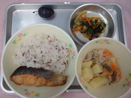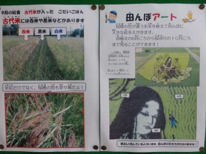 今日のごはんには、古代米が入っています。古代米には、あかまい・くろまいなどがあります。赤米は、昔はお祝いのときに食べられていて、お赤飯のルーツだといわれています。黒米は、胃腸を丈夫にし、体を強くするので、薬のようなものでした。米粒だけでなく、稲穂も赤や黒で、古代米の稲穂の色で田んぼに大きな絵をえがく「田んぼアート」というものがあります。今年は八王子でも都市緑化はちおうじフェアのイベントとして9月17日から30日に高月町で田んぼアートが公開されます。ぜひ見に行ってみて下さい。