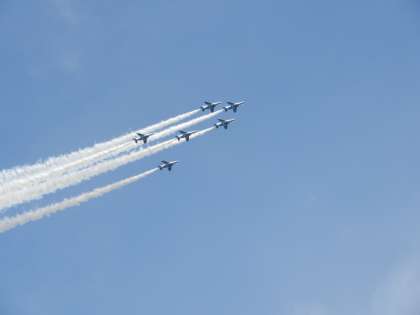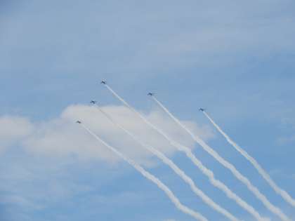 明日のブルーインパルスの展示飛行へ向けて、今日の午後、予行がありました。山田小学校のほぼ真上を、ジェット機が通り過ぎて行きました。明日の本番、いい天気になるといいのですが…台風も近づいています。