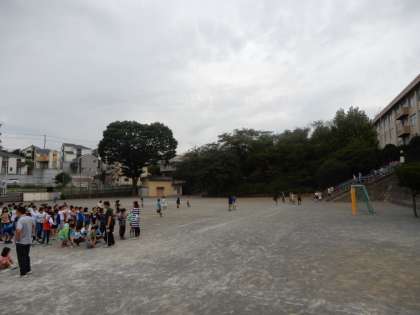 あいにくの曇り空のため、予定とはだいぶ違う飛行となりました。それでも6機の編隊が白い煙を出して通過したときは、子どもたちから歓声があがりました。昨日の予行では、様々なフォーメーションを繰り広げ、青空に八王子市の「八」を描いていたのですが、残念です。校庭で見ていた子どもたちは、早々に引き上げ、子どもまつりに突入しました。