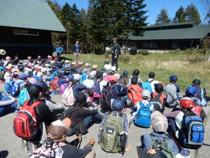 霧ヶ峰自然保養センターに到着。トイレを済ませて、登山に出発です。みんな元気です。