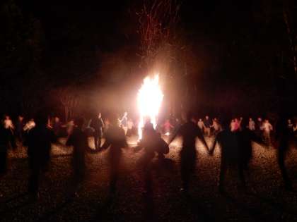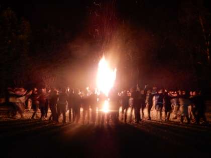 キャンプファイヤーの始まり。火の神と3人の火の子による点火の後、みんなで手を繋いで「マイムマイム」を踊りました。