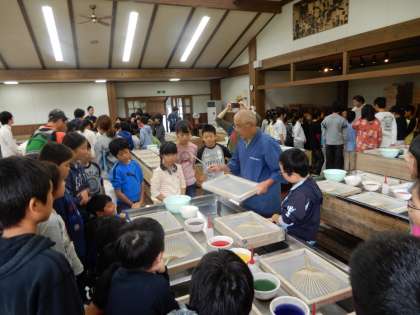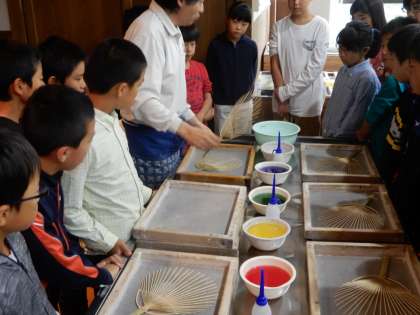 うちわ作りに挑戦です。まずは師匠から技を伝授されました。