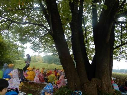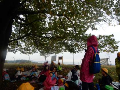お弁当タイム。小雨をよけて、大きな木の下でみんなかたまって食べました。