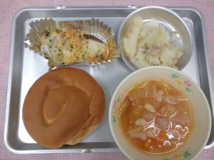 11月16日の給食 公開日 2017/11/16 更新日 2017/11/16 今日の出来事 <こんだて> うずまきパン しろみざかなのパンこやき ベーコンポテト ミネストローネ ぎゅうにゅう ミネストローネは「具だくさん」という意味のイタリアの家庭料理です。給食のミネストローネにもベーコン・インゲン豆・玉ねぎ・キャベツ・にんじん・セロリ・トマト・・と、具だくさんです。野菜のうまみや甘みがたっぷりでています。