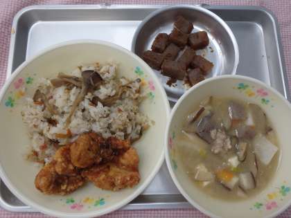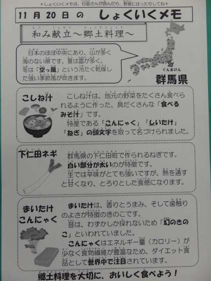 11月20日の給食 公開日 2017/11/20 更新日 2017/11/20 今日の出来事 <こんだて> まいたけごはん とりのからあげねぎソース こしねじる おかかこんにゃく ぎゅうにゅう 今日は群馬県の郷土料理献立です。郷土料理を大切に、おいしく食べましょう。