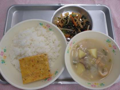 今日のごはんは、八王子市で収穫されたお米です。農家の方から「私たちが作ったお米をみんなに食べてもらえることが最高にうれしいです!私は田んぼが広がる高月町の風景が大好きで、この自然が100年後も続いてほしいと願っています。みんながお米を食べてくれることが、田んぼを守っていくことにもつながります。しっかり食べて、元気にすごしてください!」」とメッセージをいただきました。明日、11月23日は勤労感謝の日です。昔は「新嘗祭」といい、豊作に感謝する日でした。食べ物を作ってくださるの方々や食べ物になった命に感謝の気持ちをこめていただきましょう。