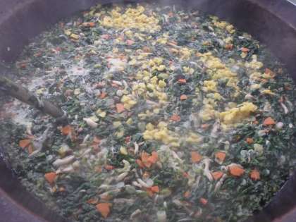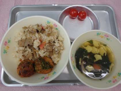 今日、11月24日は「和食の日」です。和食の味の鍵になるのは、「だしのうまみ」といいます。味は「甘み」「塩味「酸味」「苦味」「旨味」の5つが基本で、料理にコクや深みをうむのが「旨味」です。そして、だしの代表的なものは、かつお節・にぼし・こんぶです。給食の汁物やスープのだしもかつお節やにぼしなどでとっています。今日はだしの旨味をよく味わえる、すましじるです。秋らしく、イチョウ型のかまぼこを入れました。「かてめし」は八王子の郷土料理です。「かて」は混ぜるという意味で、八王子の方言で混ぜごはんのことです。お米が貴重だった時代、ご飯の量を増やすために豆や雑穀・野菜などいろいろなものを混ぜていたので、この名前がつきました。