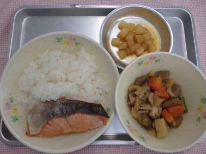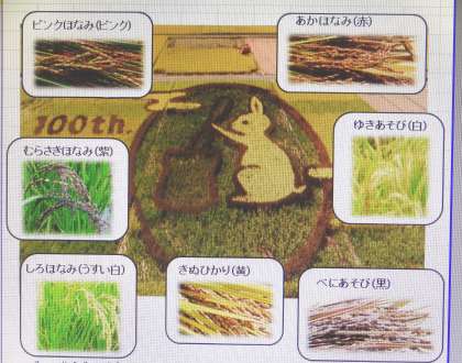 9月に都市緑化はちおうじフェアのイベントとして、高月町で田んぼアートが制作されました。田んぼアートは、数種類のお米の葉と稲穂の色を活用して、昔、地元にたくさんいた野うさぎが餅をついている様子描きました。今日のごはんには、その田んぼアートを描いていたお米が入っています。米粒の色は白なので、ごはんに色はついていませんが、もちもちした食感が特徴です。