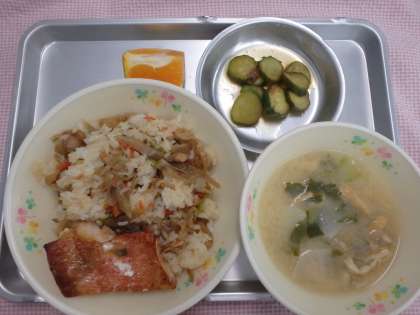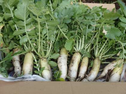 今日のみそしるに入っているだいこんは、1年生が畑で育てて収穫しただいこんです。小さくてかわいらしいだいこんで、葉も少し入れました。みそしるを食べた1年生たちは「だいこんおいし〜い!」とうれしそうでした。