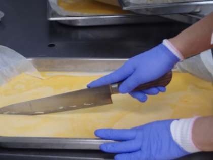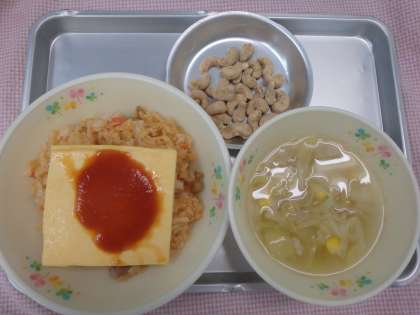 オムライスは5年3組のリクエストです。給食では1つ1つごはんに包むことはできないので、薄焼き卵をのせて食べてもらいます。