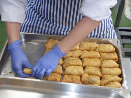 油揚げは薄く切った豆腐を油で揚げて作ります。油揚げを作る豆腐は、ふつうの豆腐ではなく、揚げたときによくふくらみ、ふっくらするように、最初から油揚げ用に作ります。揚げるときは、110度から120度の低い温度の油で揚げた後、180度から200度の高い温度の油でもう一度揚げます。油揚げ用の豆腐作りや揚げるときの温度管理など、油揚げを作るのは難しいそうです。