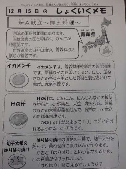 今日は青森県の郷土料理献立です。郷土料理を大切に、おいしく食べましょう。