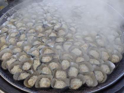 いがむしは、肉団子にもち米をまぶして蒸した中華料理で、見た目が栗の「いが」のように見えることからこの名前がつきました。中国では「珍珠丸子(チェンジュワンズ)」といいます。「珍珠(チェンズ)」とは「真珠」という意味で、蒸したもち米が真珠のように見えることからこの名前がつけられたそうなので、日本では「真珠蒸し」ともいわれています。今日の海鮮いがむしは、団子にたらのすり身とえびを入れて作りました。