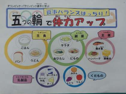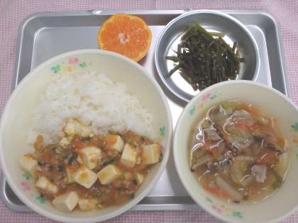 1月10日の給食 公開日 2018/01/11 更新日 2018/01/11 今日の出来事 <こんだて> ごはん マーボーどうふ くきわかめのしょうがいため くずきりスープ くだもの ぎゅうにゅう 3学期の給食が始まりました。毎日、しっかり食べて、風邪をひかず、元気にすごしていきましょう。 今日は東京2020オリンピック・パラリンピック競技大会に向けて「食事バランスばっちり!五つの輪で体力アップ」献立です。主食・主菜・副菜・果物・乳製品の五つの輪がそろった給食です。