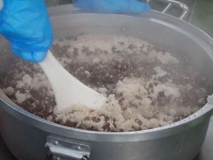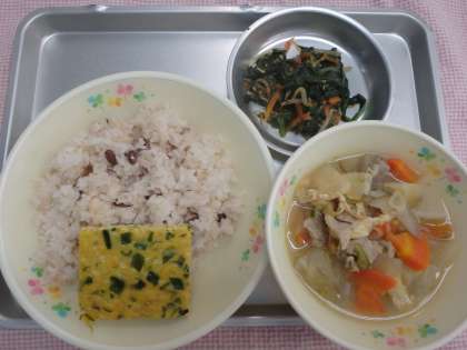 今日、1月15日は「小正月」です。小正月は、1月1日を「大正月」というのに対して呼んだ名前です。小正月には、餅花という柳などの枝に小さく丸めた餅や団子をさしたものを飾ります。豊作の前祝いをする大切な行事です。小正月の朝には、1年中病気をしないようにと「小豆がゆ」を食べる風習があります。給食では、あずきごはんをつくりました。