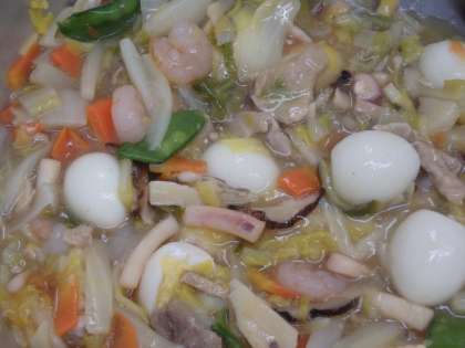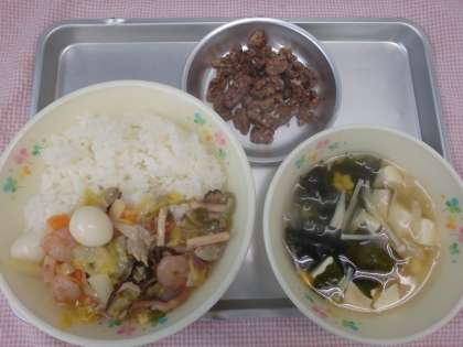 八宝菜には、何種類の食材が使われているでしょう?「八」の字がつくから8種類でしょうか?実は、「八宝菜」の「八」は「8種類の」という意味ではなく「たくさんの」という意味です。また、「八宝菜」には「宝」という字が使われています。宝のようにおいしい食材が食べることができる料理ということです。食べ物は命あるもの、まさに「宝物」ですね。給食でもたくさんの宝のような食材を使って八宝菜を作りました。