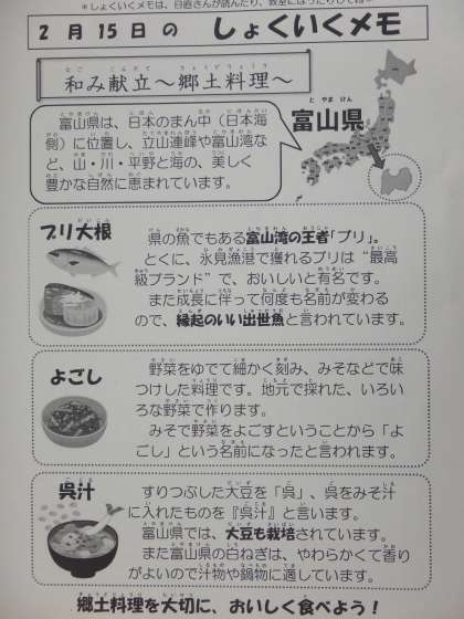 2月15日の給食 公開日 2018/02/16 更新日 2018/02/16 今日の出来事 <こんだて> きびごはん ぶりだいこん よごし ごじる ぎゅうにゅう 今日は富山県の郷土料理献立です。郷土料理を大切に、おいしく食べましょう。
