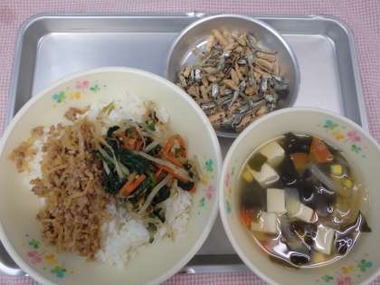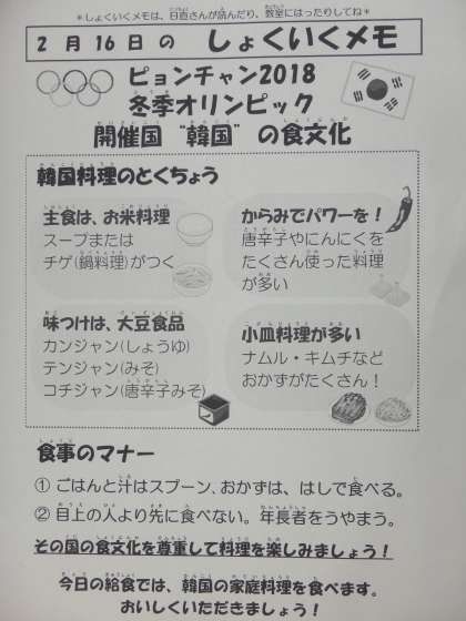 2月16日の給食 公開日 2018/02/16 更新日 2018/02/16 今日の出来事 <こんだて> ビビンバ わかめスープ ごまめナッツ ぎゅうにゅう 2月9日から韓国の平昌で冬季オリンピック・パラリンピックがおこなわれています。今日は韓国料理のビビンバです。給食のビビンバにはお肉に切り干し大根を混ぜていて、野菜がたっぷり。辛み成分で体があたたまります。その国の食文化を知って、料理を楽しみましょう。