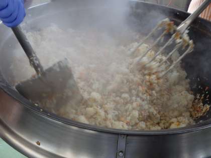 「チャーハン」というのは中国語で、「白飯をいろいろな具と一緒に油で炒めた中華料理」を指す「チャオファン」という読み方がなまったものです。チャーハンの起源は「プラーカ」というインド料理だといわれています。「プラーカ」は、鶏や豚を煮た煮汁でごはんを炊き、その煮込んだ肉と一緒に炒めた料理です。給食では、量が多くてごはんを炒めて作ることができないので、具とごはんを混ぜ合わせて作りました。