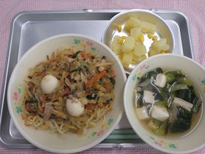 いわさき先生からのメッセージ・・・あんかけやきそばは、豚肉・うずらの卵・たけのこ・にんじん・キャベツ・たまねぎ・ほししいたけなど、たくさんの食材が入った「あん」がかかっているので、おいしさも、のどごしも、とってもよく、どんどん食べられます。栄養バランス満点のあんかけやきそばをよくかんで、たくさん食べて、もりもり成長していってください。