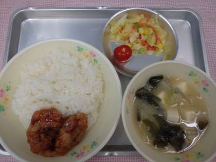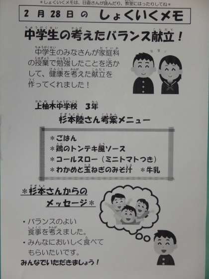 2月28日の給食 公開日 2018/03/01 更新日 2018/03/01 今日の出来事 <こんだて> ごはん とりのトンテキふうソース コールスロー(ミニトマトつき) たまねぎとわかめのみそしる ぎゅうにゅう 今日は中学生が考えたバランス献立です。みんなでいただきましょう。