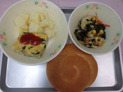 2月4日の給食 公開日 2019/02/04 更新日 2019/02/04 今日の出来事 <こんだて> パン ハムとほうれんそうのオムレツ こふきいも わかめサラダ ぎゅうにゅう 今日は卵料理のオムレツです。卵には、体の血や肉をつくるたんぱく質や鉄分という栄養が多く含まれています。日本は、世界で3番目に卵を多く食べる国で、1人が1年間に食べる卵の量は約300個だそうです。