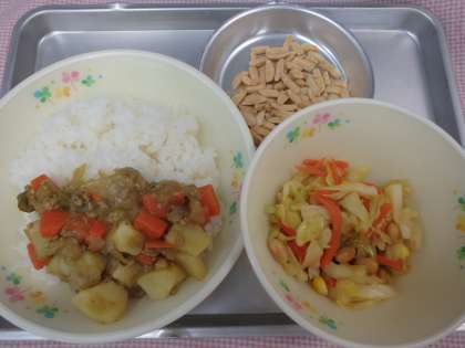 2月15日の給食 公開日 2019/02/18 更新日 2019/02/18 今日の出来事 <こんだて> サブジどんぶり ビーンズサラダ きなこアーモンド オレンジジュース 今日は縦割り交流給食です。6年生に感謝の気持ちをこめて、楽しく会食しましょう。 サブジどんの「サブジ」は野菜のことです。ルーを入れずに作る、さっぱりとしたカレーです。