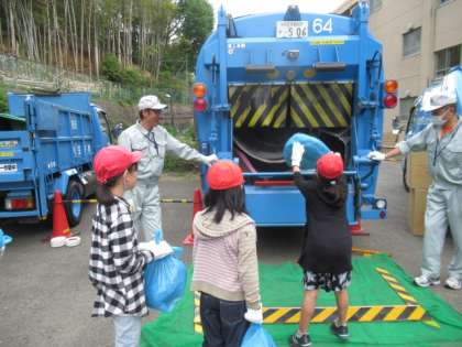 ゴミ投入体験 公開日 2019/05/07 更新日 2019/05/07 今日の出来事 本日、4年生がゲストティーチャーを招き、社会科でゴミに関する学習を行いました。不法投棄などの社会問題についてクイズを交えて学んだり、ゴミ収集車にゴミを投入する体験やゴミの分別ゲームなどに取り組んだりしました。