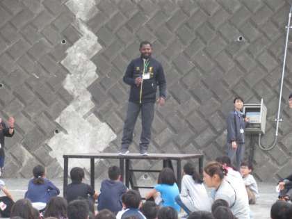 ALTの紹介 公開日 2019/05/09 更新日 2019/05/09 今日の出来事 今朝、レク集会の後、新しいALTの紹介をしました。エイベル オノワ(Abel Onowa)先生です。ナイジェリア出身で、お寿司とサッカーが大好きな優しい先生です。主に3〜6年生の外国語活動の授業に入ります。どうぞよろしくお願いいたします。