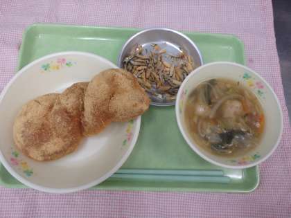 昔、給食で出るパンはコッペパンだけでした。昭和30年代の終わりごろからあげパンなどの調理したパンが給食ででるようになりました。いつでも大人気です。あげパンは、パンを油で揚げてお砂糖やきな粉をまぶしたものです。今日のあげパンは、砂糖ときなこをまぜた、きな粉あげパンです。
