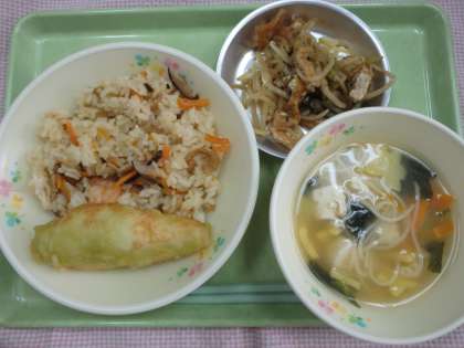 明後日、7月7日は七夕ですね。今日は、七夕献立です。七夕にはそうめんを食べる風習があります。これは、そうめんをおりひめのはたおりの糸にみたてているからといわれています。そうめんを天の川・にんじんを短冊にみたて、かまぼこの星と一緒にすまし汁にしました。